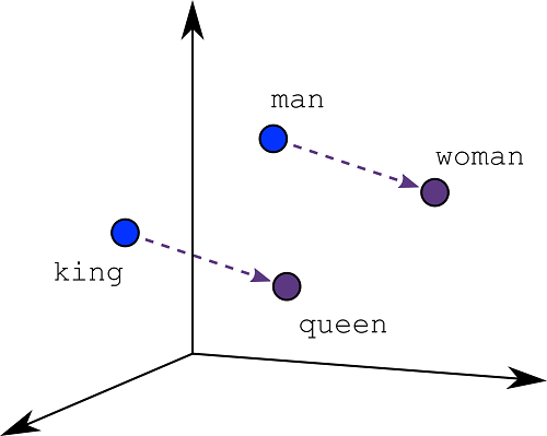 Embeddings zetten tekst dus om naar vectoren. Bij word2vec zijn semantisch verwante teksten dicht bij elkaar in de vectorruimte geplaatst. Bijvoorbeeld, omdat de woorden ‘kat’ en ‘hond’ in teksten vaak samen voorkomen met het woord ‘dierenarts’, kan men de overeenkomstige drie vectoren dicht bij elkaar vinden in de vectorruimte. Ook vergelijkbare relaties tussen woorden zijn in de vectorruimte vaak terug te vinden (zie Figuur).